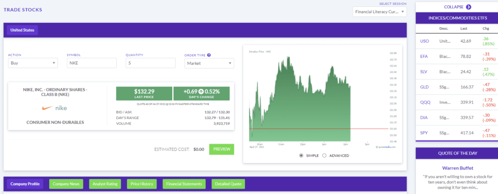 Income statements, balance sheets, cash flow statements, historical prices, accounting ratios, SEC filings, option chains, and over 40 other data points are available in our Research Center. We even integrated company info, analyst ratings, symbol lookup, and charting tools directly into the trading page, so students can do all their investing research all in one place.